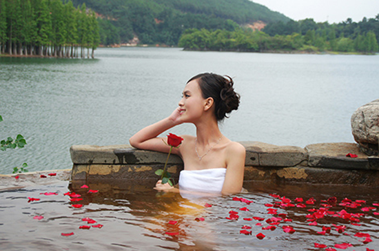 花浴温泉:包含玫瑰花浴、茉莉花浴等。既可润泽肌肤,补充皮肤水分、增强皮肤弹性,又使人体沁入天然花瓣芳香,美颜悦色、舒缓身心。
