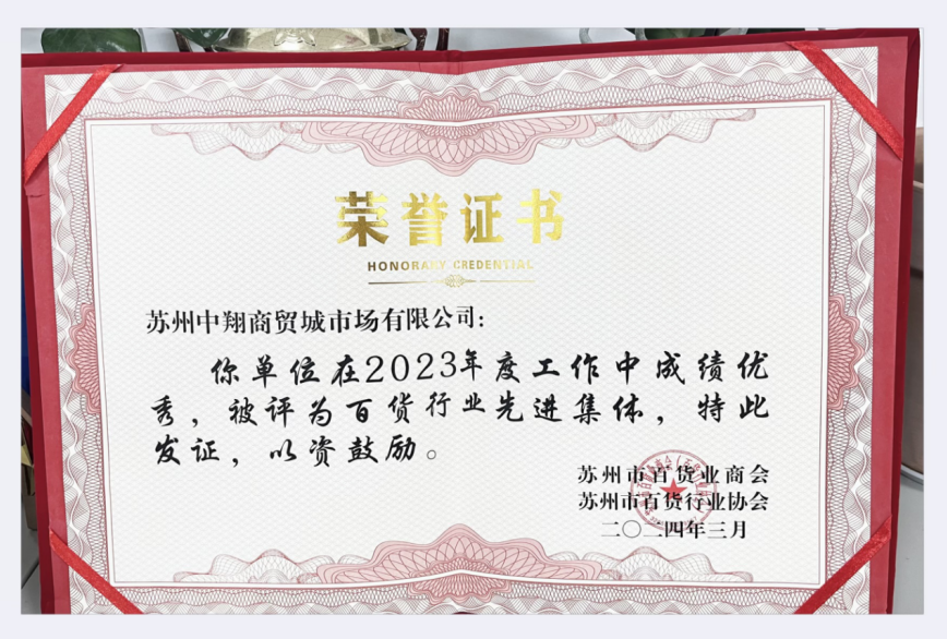匠心耕耘,喜得荣誉。阳春三月,中翔商贸城被苏州市百货业商会授予2023年度“百货行业先进集体”奖项,这是中翔商贸城全体员工共同努力的结果,也是对中翔商贸城市场工作的肯定。